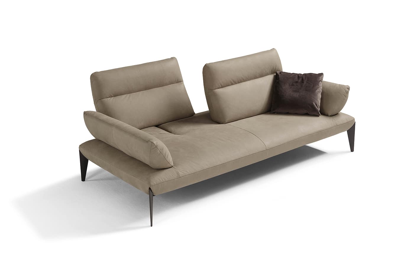 The geometric yet strict metal feet slim the sofa, playing with the seats’ diagonal lines. The manual tilting backrests allow the seat extension deep for perfect relaxation.