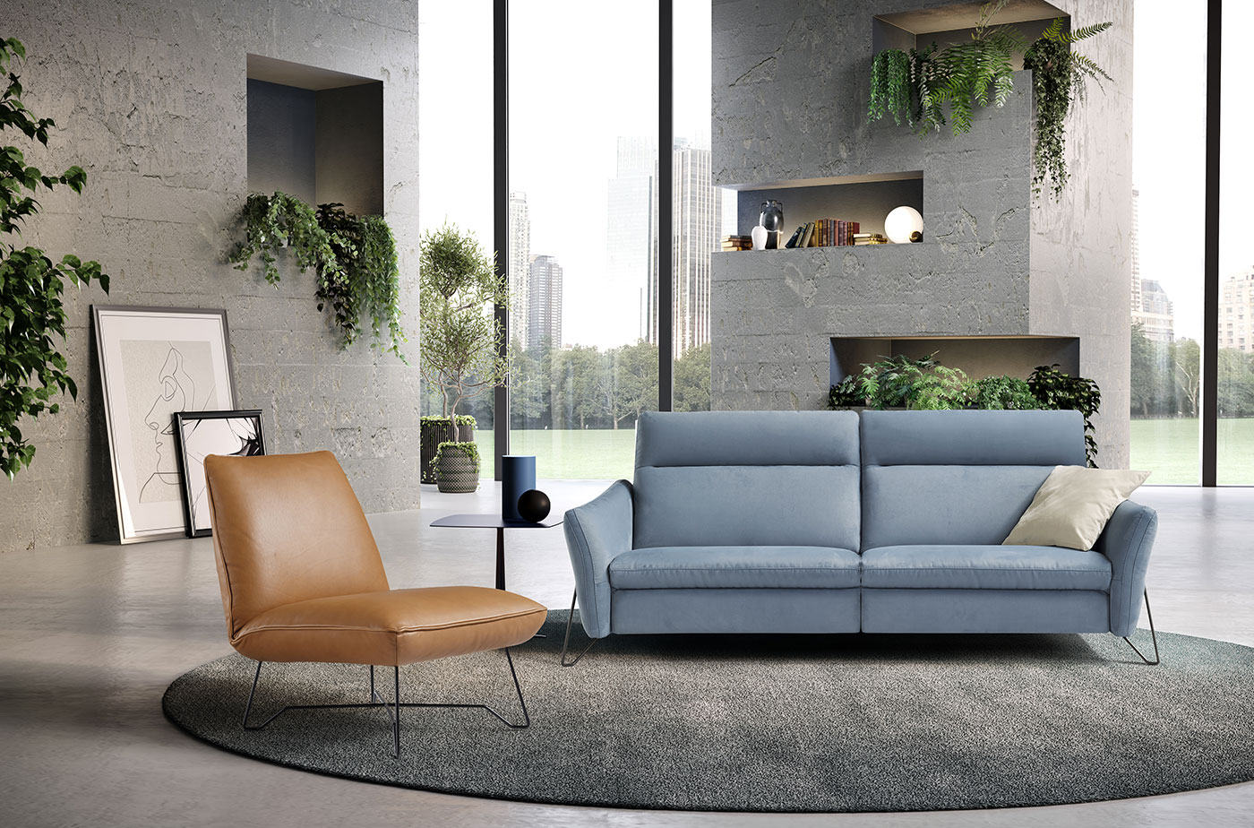 GAIA is the relaxing sofa with clean and essential lines, characterized by the elegant metal feet that goes on up the armrest. Available in more than 500 coloured coverings, GAIA has got the same industrial style of LIA armchair, combinable with it to give a metropolitan look to your living space.